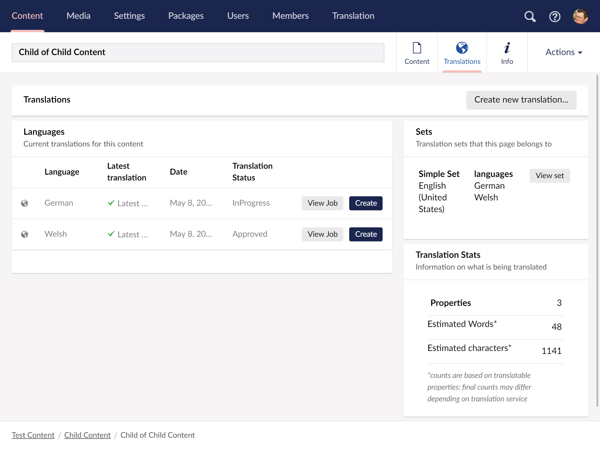 The Translation Manager Content App allows you to see all the details of a node's translation, the Translation jobs it is in, and the estimated word and character counts.